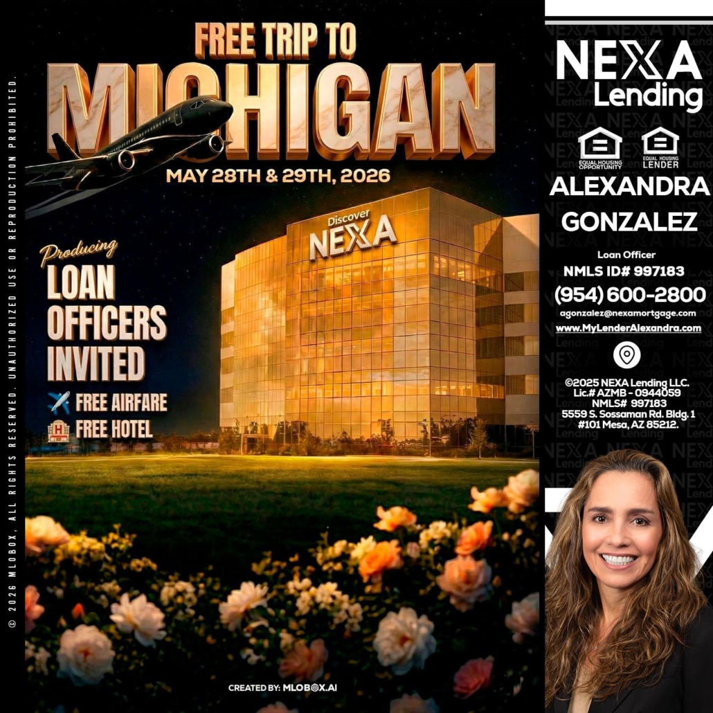 FREE TRIP TO MICHIGAN - Alexandra Gonzalez -Loan OfficerHi, my name is Alexandra Gonzalez. I’m a Loan Officer with NEXA Lending LLC., offering personalized mortgage solutions, fast customized quotes, great rates and service with integrity.