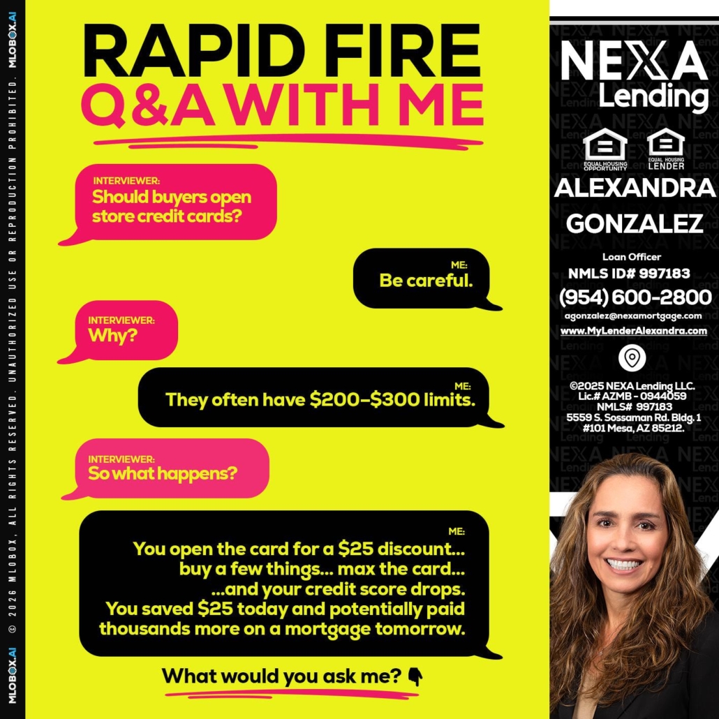 RAPID FIRE Q&A - Alexandra Gonzalez -Loan OfficerHi, my name is Alexandra Gonzalez. I’m a Loan Officer with NEXA Lending LLC., offering personalized mortgage solutions, fast customized quotes, great rates and service with integrity.